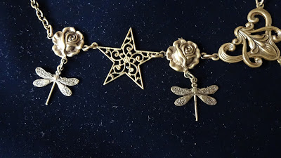 Questa collana io l'ho amata molto, unisce alcuni elementi che mi sono molto cari: le libellule, le rose vittoriane e soprattutto lo swarovky patinato. Io amo molto questi swarovski patinati, hanno qualcosa di antico, ma soprattutto lo splendore del cristallo è visibile solo attraverso i fori che la patiina lascia liberi e questo lo rende davvero misterioso e magico. Ho completato il montaggio con stelle filigranate, libelluline e splendide rose vittoriane. E' un gioiello molto femminile, con un'aria vintage, ma anche fatato e prezioso come pochi che ho fatto. Spero che piaccia anche a voi.